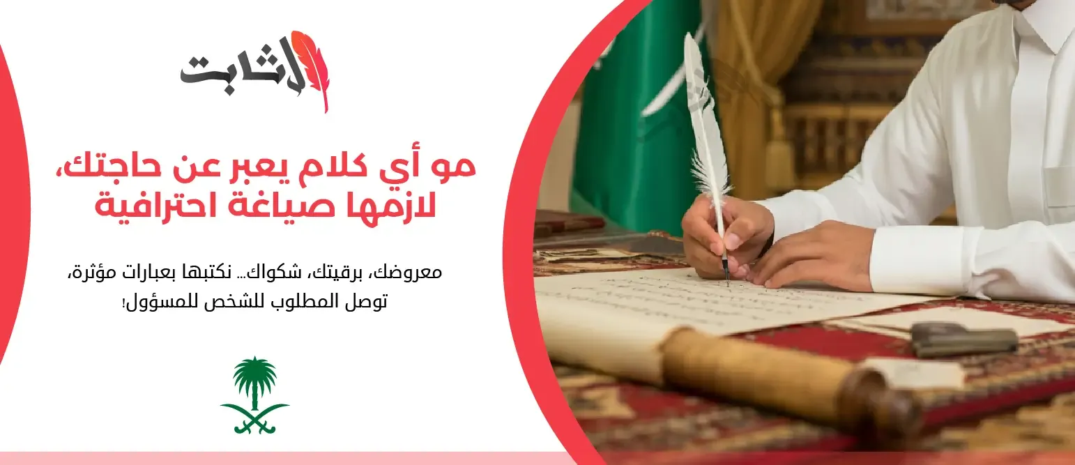 منصة الـ ثابت اول منصة سعودية متخصصة في كتابة الخطابات وكتابة المعاريض وكتابة الشكاوى، التظلمات، الطلبات، وارسال البرقيات بكافة أنواعها ولكافة الجهات مثل الديوان الملكي، وزارة الداخلية...