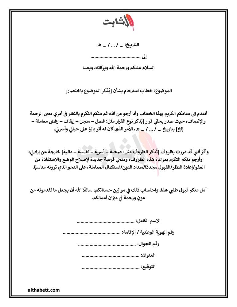 يستخدم لطلب العفو أو تخفيف العقوبة عن سجين، ويتم توجيه هذا الخطاب إلى الجهات القضائية أو السلطات العليا مثل الديوان الملكي أو وزارة الداخلية أو الإمارة.