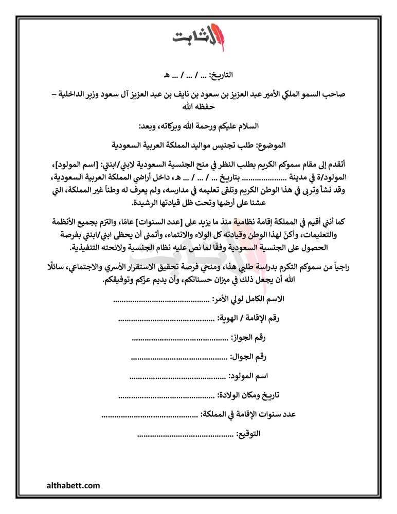 لتقديم طلب تجنيس المواليد في المملكة العربية السعودية، يجب اتباع الخطوات التالية: