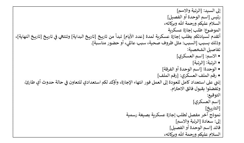 إليك كيفية التنسيق التي تتبعها آل ثابت عند كتابة معروض طلب الإجازة العسكرية: