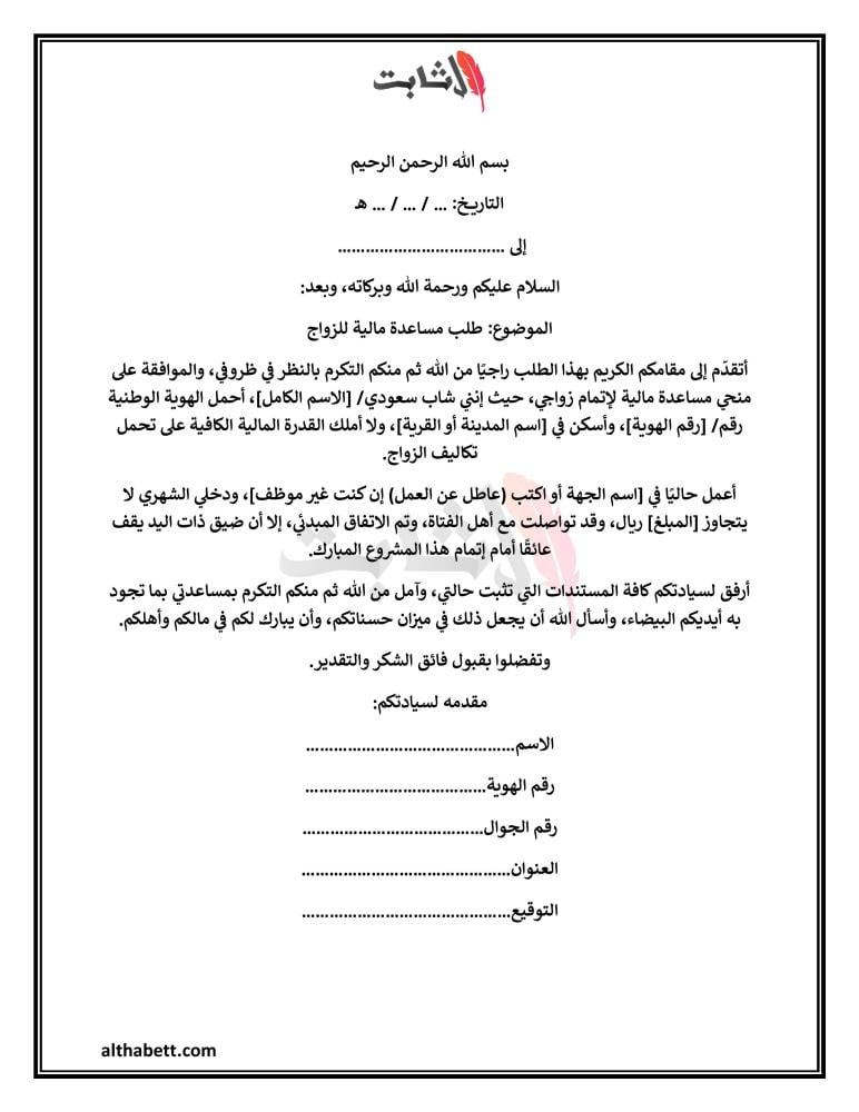 ابدأ بتحية رسمية تليق بالجهة الموجهة لها الخطاب، ثم قدّم نفسك بذكر الاسم ورقم الهوية ومكان الإقامة. بعد ذلك وضّح سبب الطلب بشكل مختصر: "أتقدم إليكم بطلب مساعدة مالية لإتمام زواجي نظرًا لظروفي المعيشية الصعبة…" مع إنهاء الخطاب بعبارات الاحترام والدعاء.
