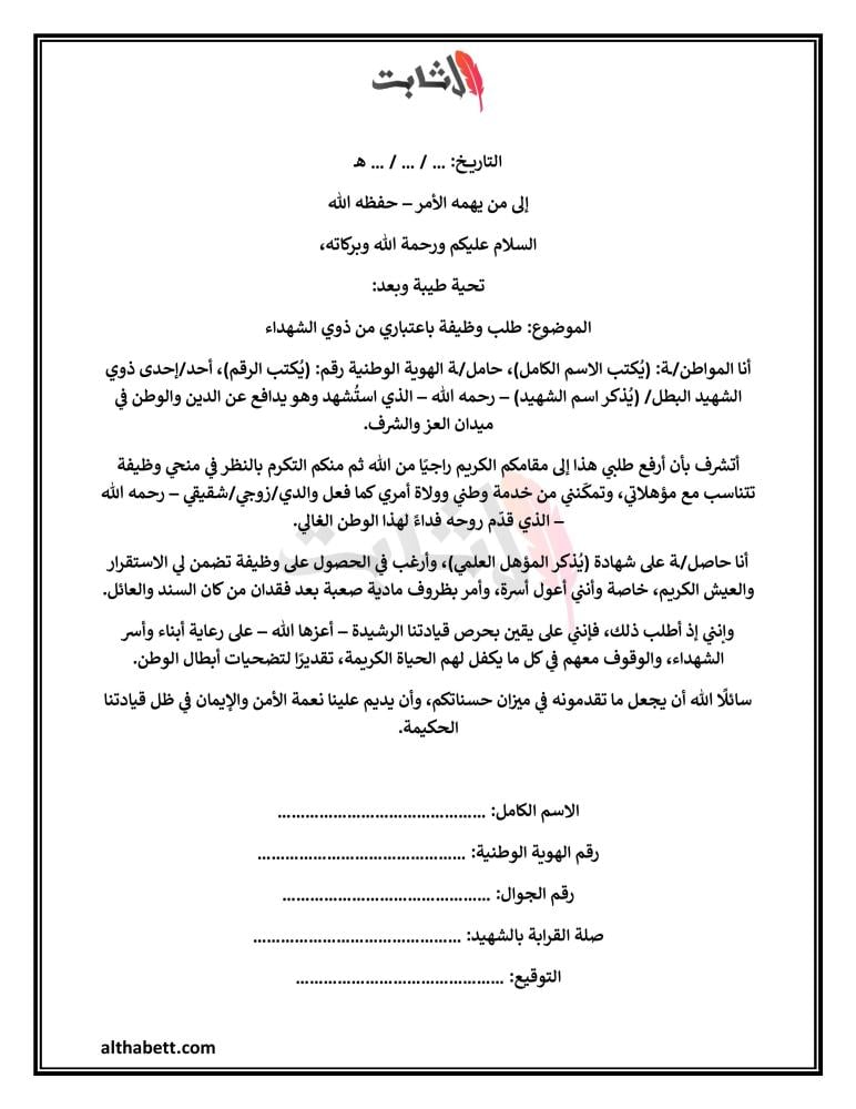 مميزات الحصول على خدمة كتابة معروض طلب وظيفة لذوي الشهداء من آل ثابت:
