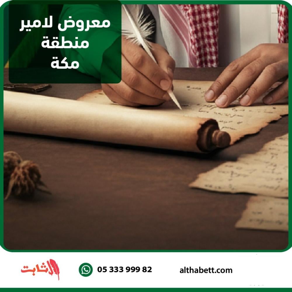 إذا كنت بحاجة إلى خدمة كتابة معروض مؤثر لأمير منطقة مكة، نحن في موقع آل ثابت نعرض لك خدمات كتابة المعروضات الرسمية بشكل احترافي يضمن تقديم طلبك بأعلى مستوى من الدقة والاحترافية، بالإضافة إلى إرساله إلى الجهات المعنية، تواصل معنا الحين من خلال الواتساب للحصول على صياغة معروض مؤثر يزيد من فرص استجابة الأمير وتحقيق الهدف المطلوب.