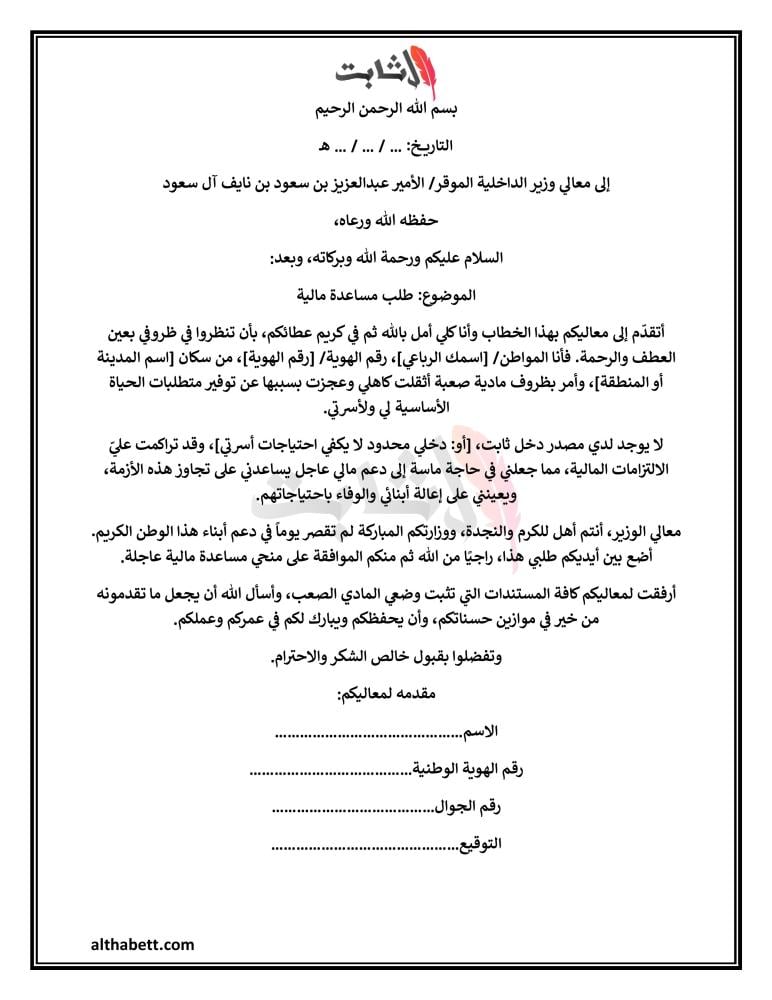 مميزات كتابة نموذج معروض لوزير الداخلية طلب مساعدة مالية من خلال آل ثابت