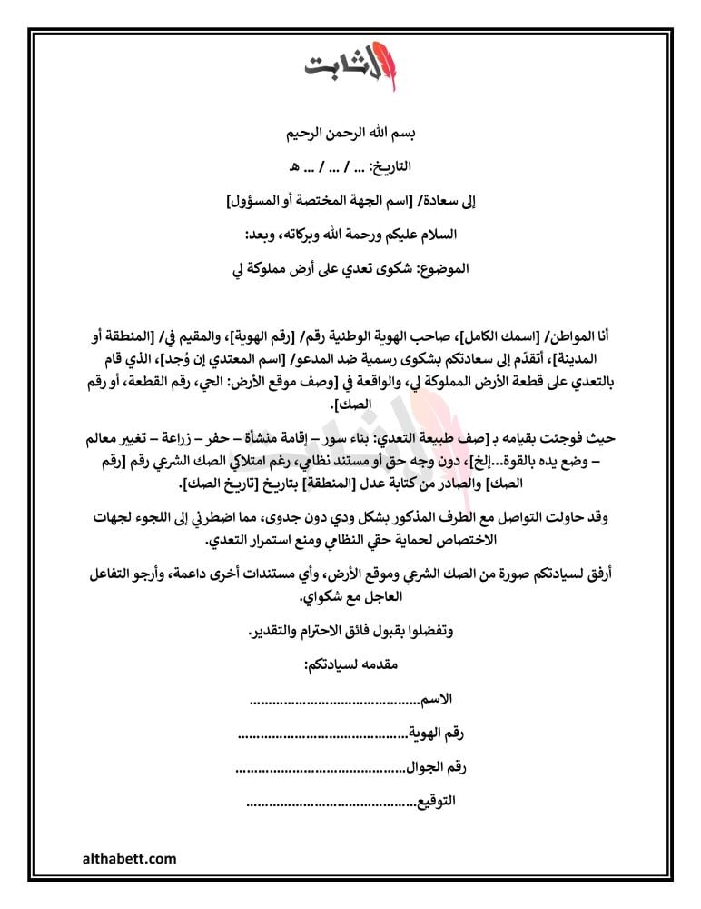 نموذج شكوى تعدي على أرض